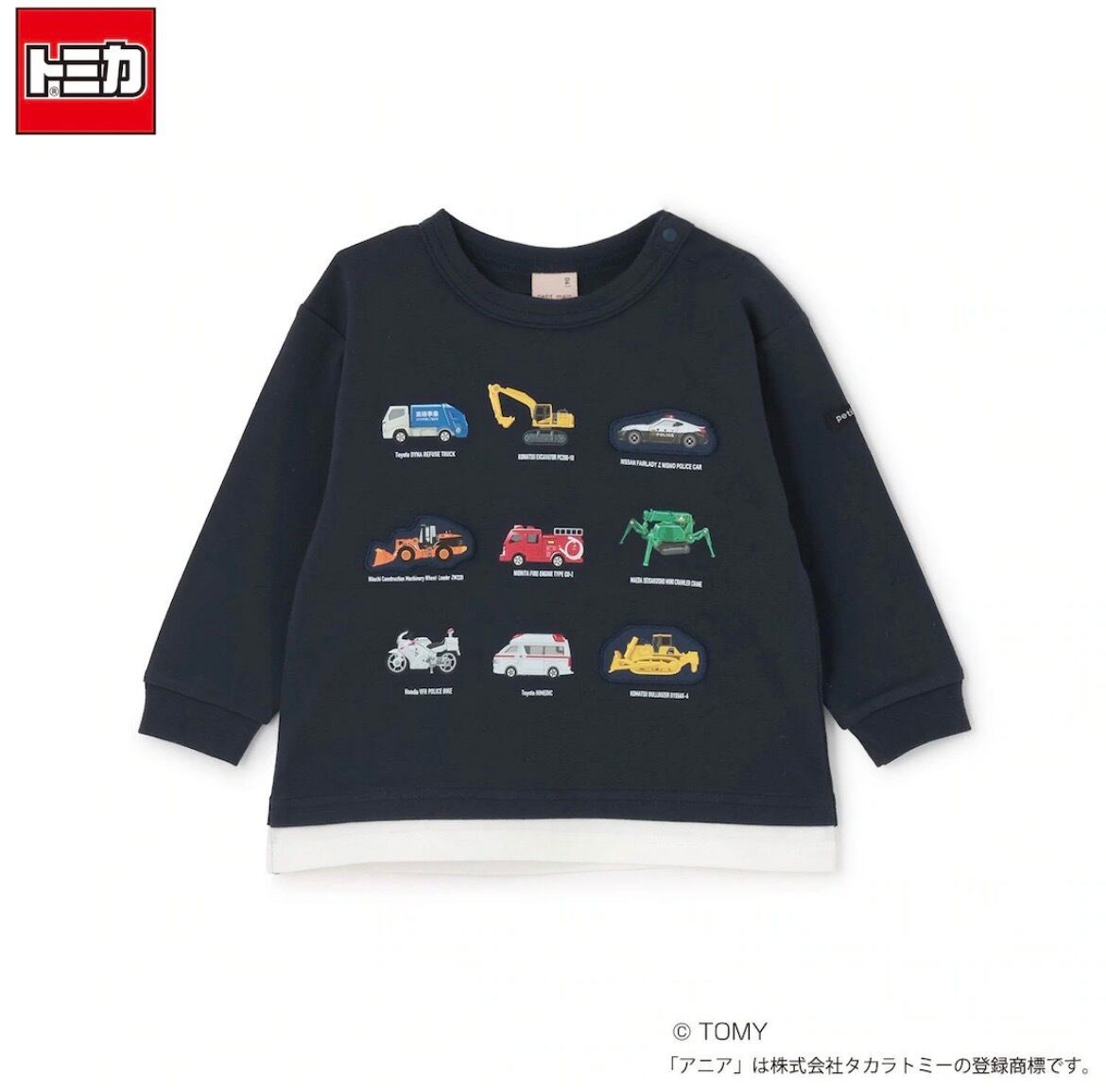 トミカのグラフィックデザインが魅力の長袖Tシャツ。